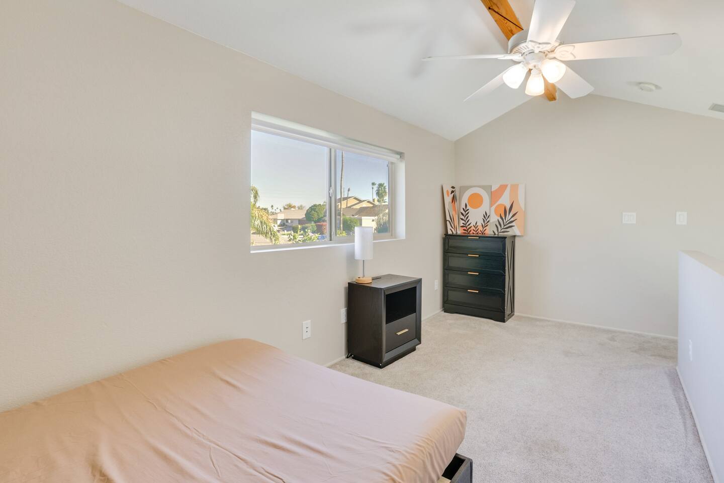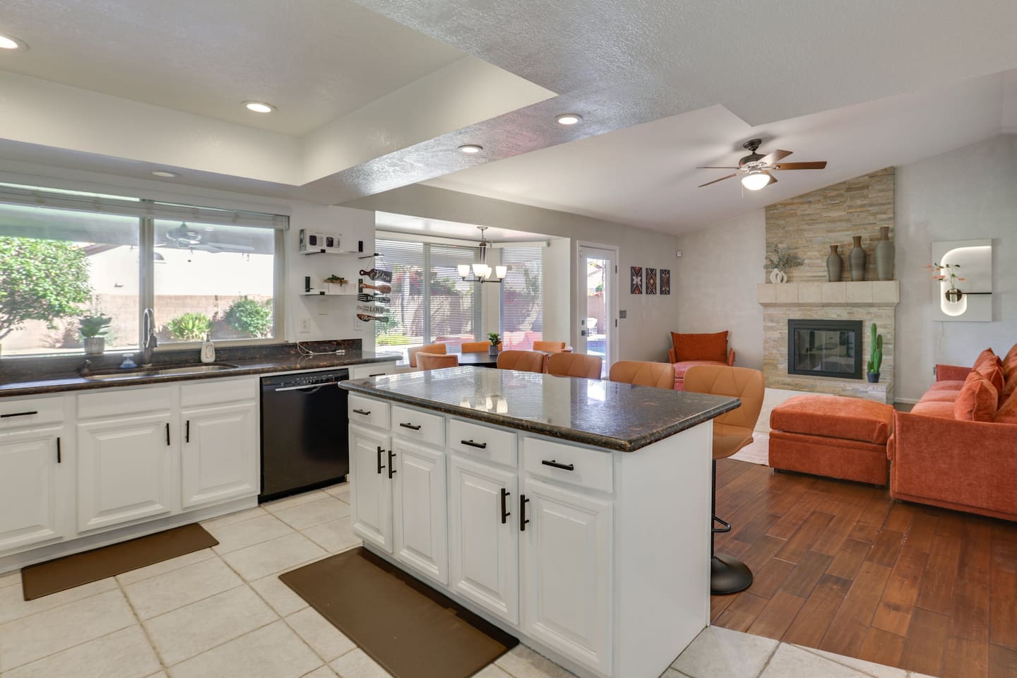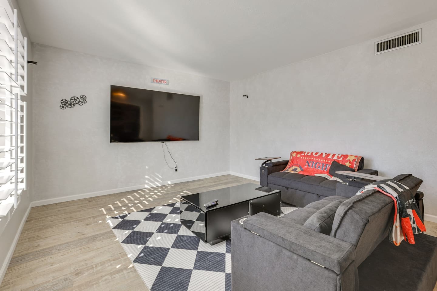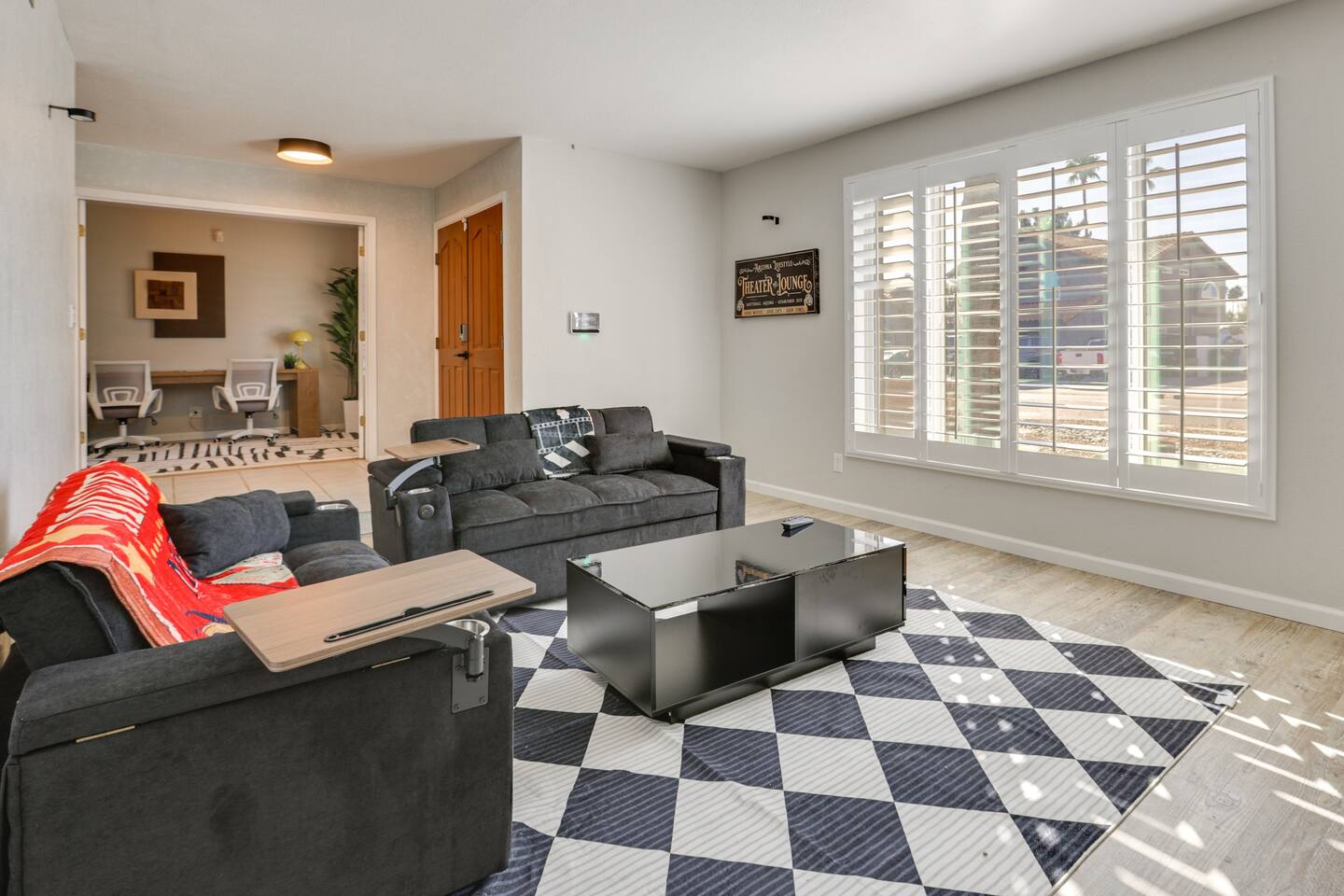 This sprawling home is designed for group entertainment and relaxation, featuring a main house and a private detached casita. Main House (4 Bedrooms, 2 Bathrooms): Spacious, open-concept living and dining area filled with natural light. Fully equipped kitchen with modern appliances. Dedicated theater room for movie nights. Fun-filled game space for endless entertainment. Indoor wood-burning fireplace &outdoor fire pit. Pet-friendly home. Home is equipped with crib, Pack ’n Play & high chair to help make your stay more comfortable. Noise decibel monitors in common areas. In-home washer and dryer. Smart TVs throughout. Guest Casita (1 Bedroom, 1 Bathroom): Private entrance for added privacy. Cozy living room and kitchenette. Dedicated workspace, perfect for remote work. Resort-Style Backyard: Sparkling private pool. 370 sq. ft. covered patio with an outdoor dining area. BBQ grill for cookouts. Large grassy yard for lounging and games. Sleeping Arrangements (Sleeps 12): Bedroom 1: 1 King Bed Bedroom 2: 1 Queen Bed Bedroom 3: 1 Queen Bed Bedroom 4: 1 Bunk Bed Bedroom 5 (Casita): 1 Small Double Bed