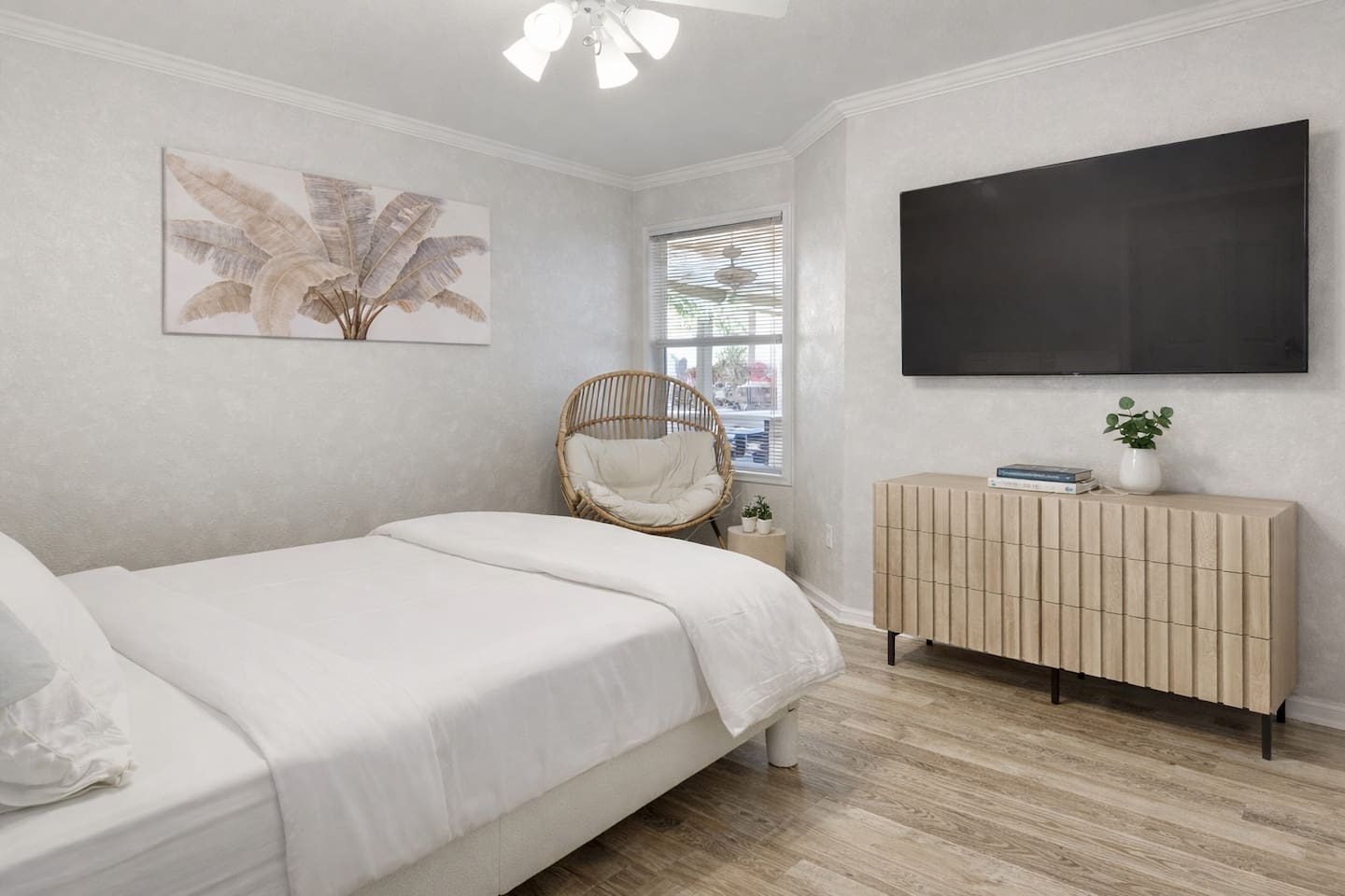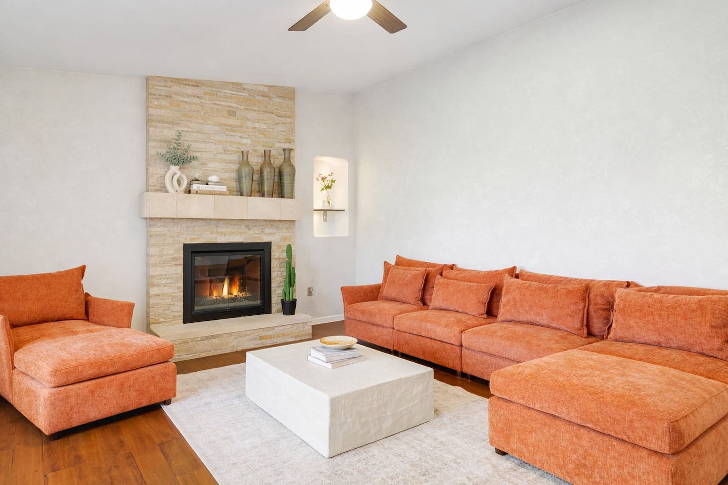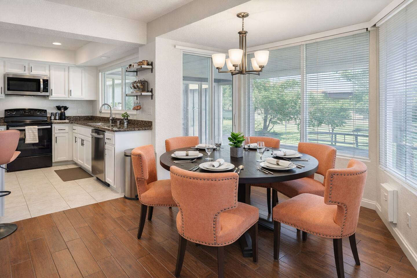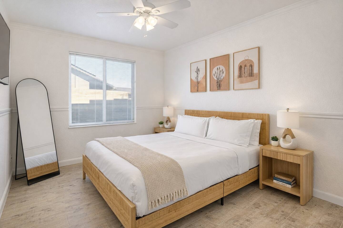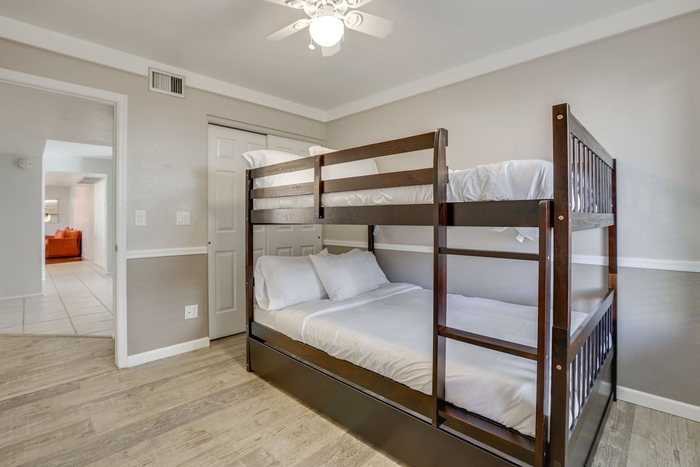 This sprawling home is designed for group entertainment and relaxation, featuring a main house and a private detached casita. Main House (4 Bedrooms, 2 Bathrooms): Spacious, open-concept living and dining area filled with natural light. Fully equipped kitchen with modern appliances. Dedicated theater room for movie nights. Fun-filled game space for endless entertainment. Indoor wood-burning fireplace &outdoor fire pit. Pet-friendly home. Home is equipped with crib, Pack ’n Play & high chair to help make your stay more comfortable. Noise decibel monitors in common areas. In-home washer and dryer. Smart TVs throughout. Guest Casita (1 Bedroom, 1 Bathroom): Private entrance for added privacy. Cozy living room and kitchenette. Dedicated workspace, perfect for remote work. Resort-Style Backyard: Sparkling private pool. 370 sq. ft. covered patio with an outdoor dining area. BBQ grill for cookouts. Large grassy yard for lounging and games. Sleeping Arrangements (Sleeps 12): Bedroom 1: 1 King Bed Bedroom 2: 1 Queen Bed Bedroom 3: 1 Queen Bed Bedroom 4: 1 Bunk Bed Bedroom 5 (Casita): 1 Small Double Bed